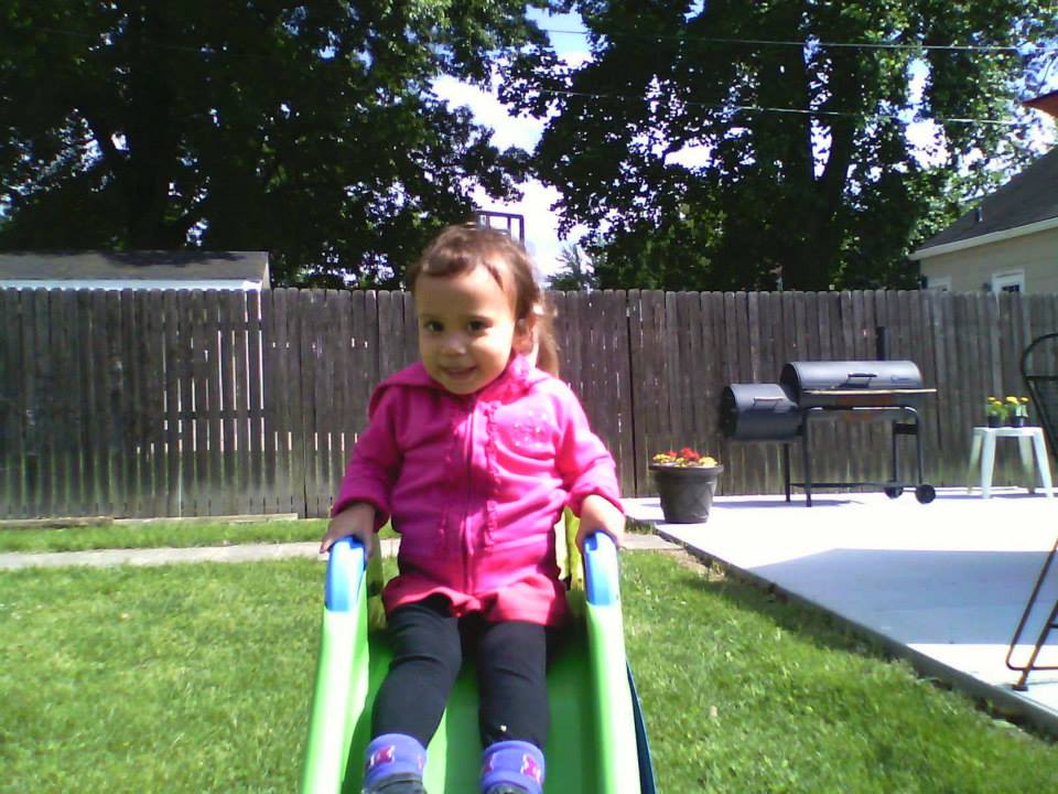 Lucia in a hoody! Enjoying her own private slide in Paw-Paw and Gamma's yard.