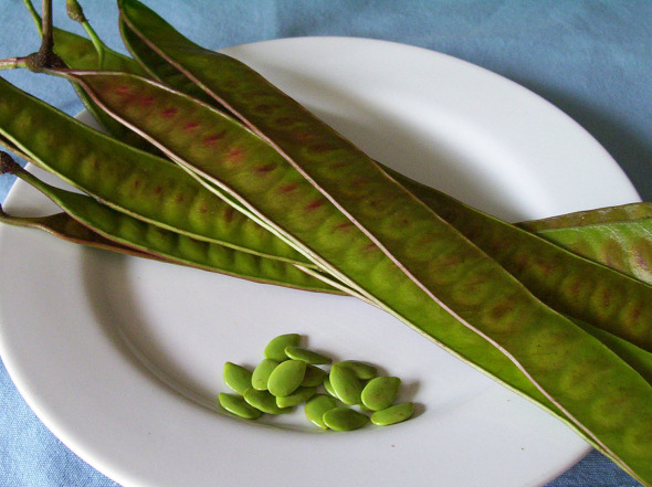Guajes grow on a tree and you eat the softish seeds on the inside of the pod. It’s easy to open the pods, making for convenient snackfood if you have a tree around. (You’re jealous, aren’t you? My guaje tree is better than your convenience store.) You can also make salsa from it, of course.